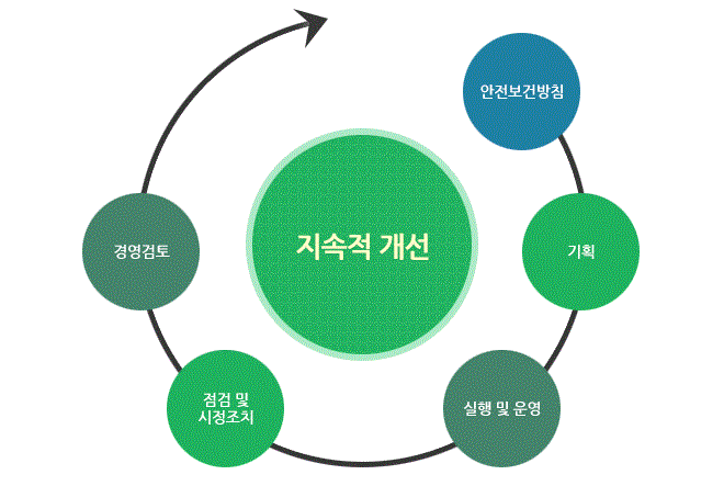 - 안전보건상의 유해, 위험요인을 지속적으로 파악하고 리스크 관리를 통하여 사고발생을 원천적으로 봉쇄 하거나 최소화하며 법률을 준수하고 전반적인 안전보건상의 성과개선을 통하여 안전하고 건강한 작업환경 조성을 이루는데 있으며 이를 통한 고객 및 이해관계자 만족을 추구할 수 있음