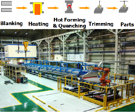 프레스 성형 후 상온까지 급속 냉각하는 성형 기술. - 프레스 금형 내에서 보론강판의 퀜칭이 이루어지며, 프레스 금형의